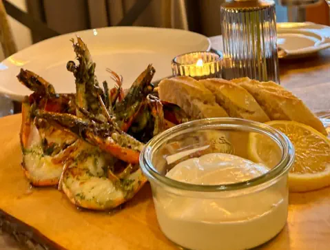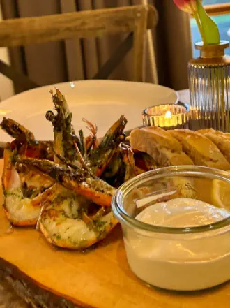 Garnelen mit Aioli & Baguette 33 Euro zusätzlich zur Abendkarte (nur auf Reservierung)